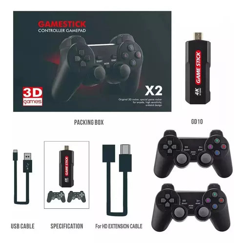 Consola Videojuego Retro HDMI 4K Game Stick X2 128GB InalámbricaRevive la era dorada de los videojuegos con la Consola Videojuego Retro HDMI 4K Game Stick X2 128GB Inalámbrica. Diseñada para ofrecer una experiencia de juego retro auténtica y de alta calidad, esta consola compacta y portátil es perfecta para cualquier entusiasta de los videojuegos clásicos.Especificaciones Técnicas:Resolución de Salida: Hasta 4K Ultra HD.Capacidad de Almacenamiento: 128GB.Conectividad: HDMI para la salida de video y audio, USB para alimentación.Controladores: Incluye controladores inalámbricos.Compatibilidad: Compatible con una variedad de consolas retro (NES, SNES, Sega Genesis, PlayStation 1, etc.).Sistema Operativo: Sistema basado en Linux o Android con emuladores preinstalados.Juegos Preinstalados: Miles de juegos retro de diversas plataformas.Contenido del Paquete:Game Stick X2: Dispositivo principal con conector HDMI.Controladores Inalámbricos: Generalmente dos, con conexión USB para recarga.Cable de Alimentación USB: Para conectar el dispositivo a una fuente de energía.Adaptador de Corriente: Puede incluirse o necesitar un puerto USB en el televisor.Manual de Usuario: Guía para la instalación y uso.LOS ARTICULOS SE ENVIAN AL AZAR DE COLORES SI EXISTE ALGUN PERCANSE O GARANTIA FAVOR COMUNICARME PRIMERO PARA DAR PRONTA SOLUCION ANTES DE GENERAR LA ORDEN DE GARANTIA POR LA PLATAFORMA